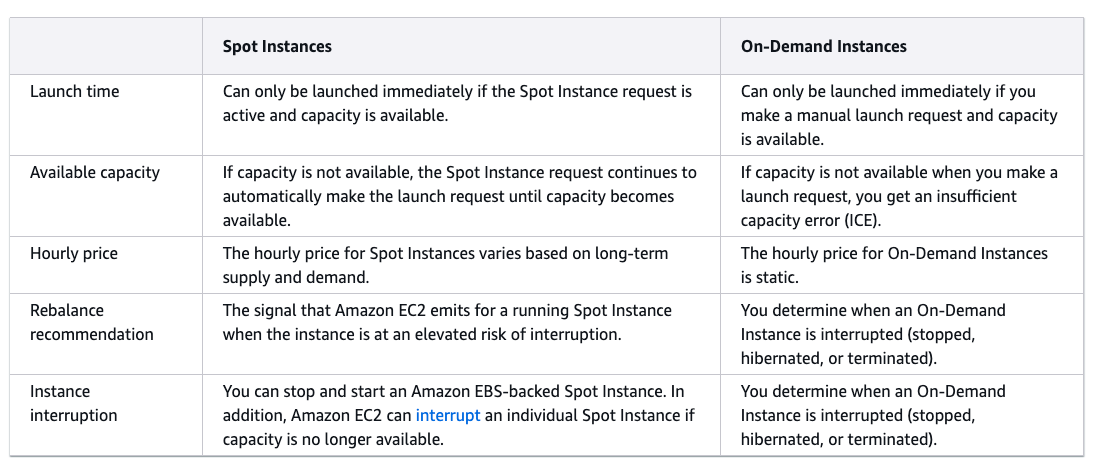 Spot instances come up with some limitations compared to on-demand instances. Here are the differences:
