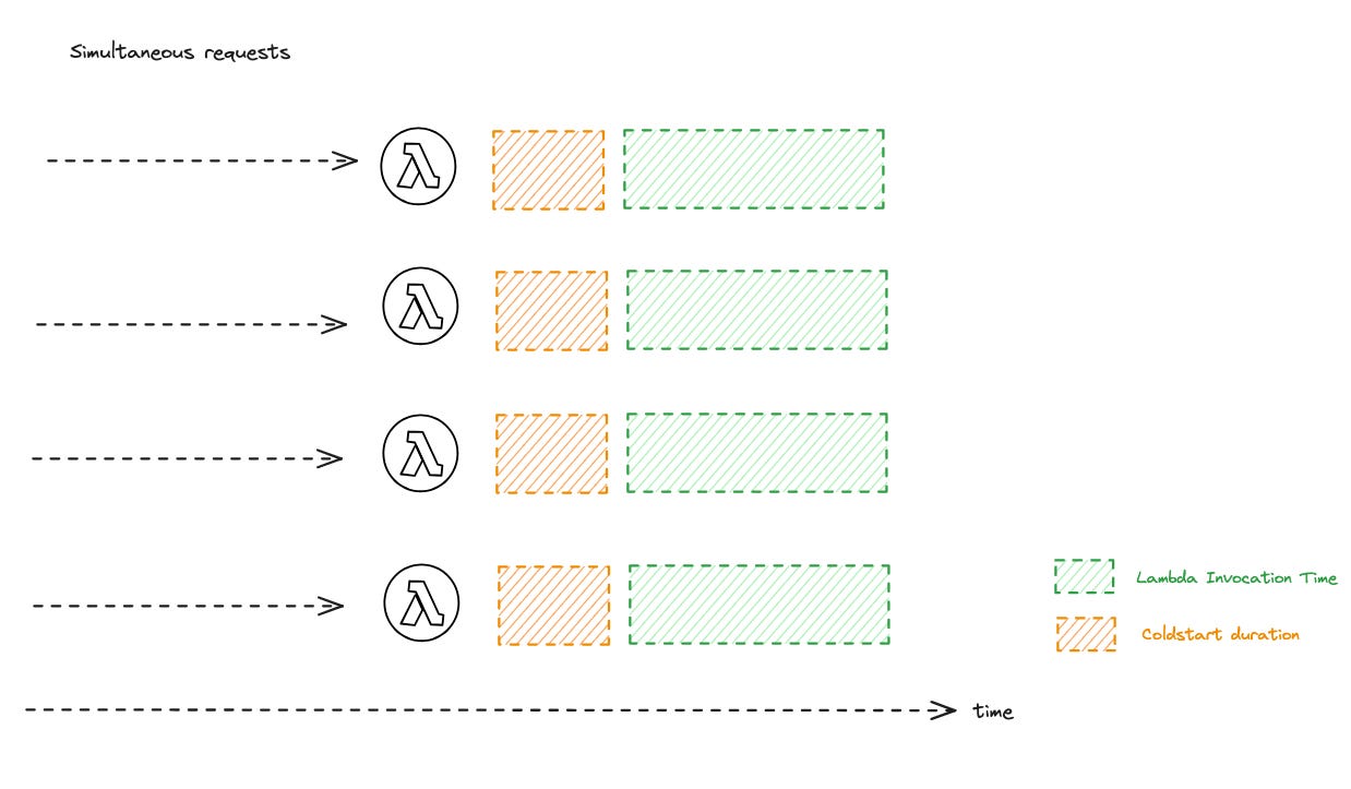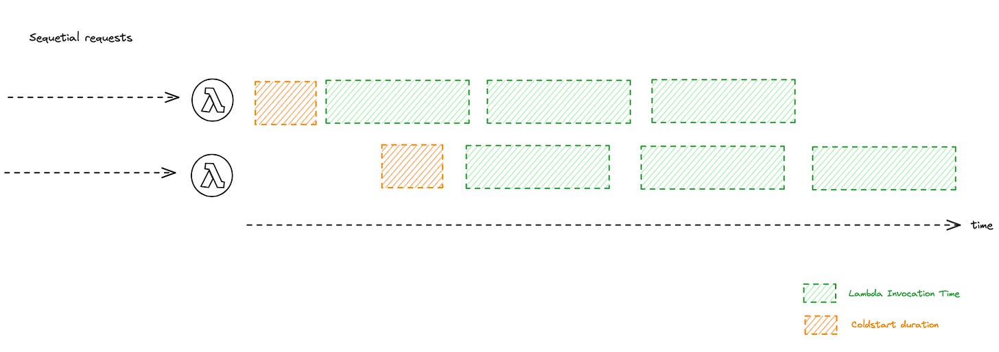 But if the requests are subsequent, only the couple of initial invocations may experience the cold start, the other invocation will utilize the existing warm environments.