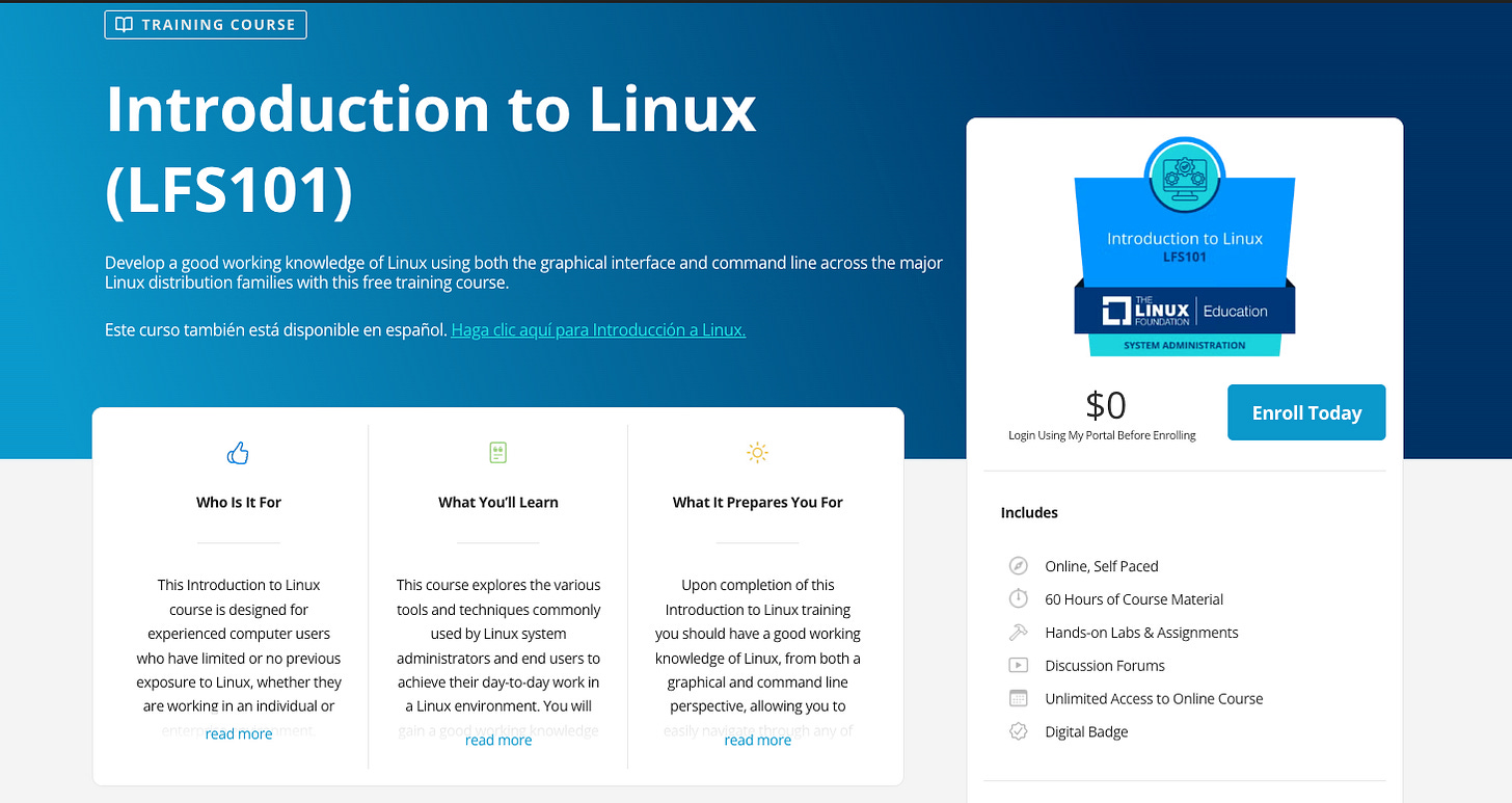 The course Introduction to Linux (LFS101), provided by the Linux Foundation, is a comprehensive beginner-level program designed to give you a solid working knowledge of the Linux operating system. It is one of the most popular introductory courses in the industry and is available for free.