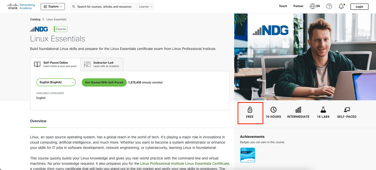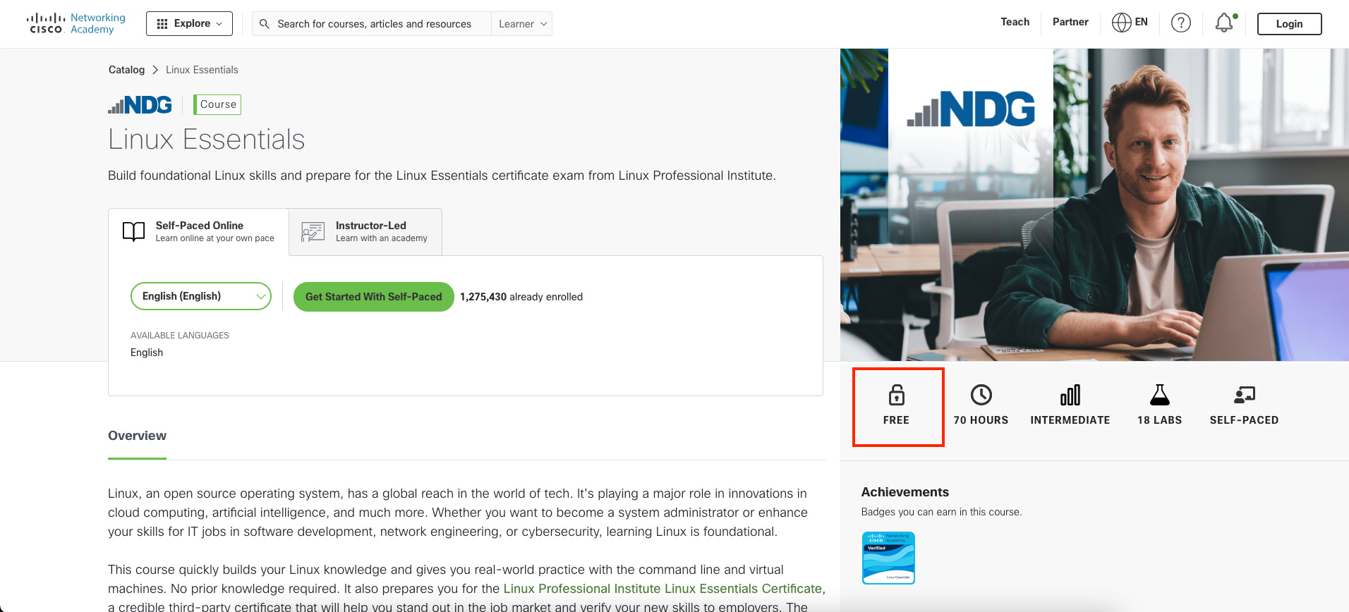 The Linux Essentials course, offered by the Cisco Networking Academy (in partnership with NDG - Network Development Group), is an entry-level program specifically designed to prepare you for the LPI (Linux Professional Institute) Linux Essentials Professional Development Certificate.